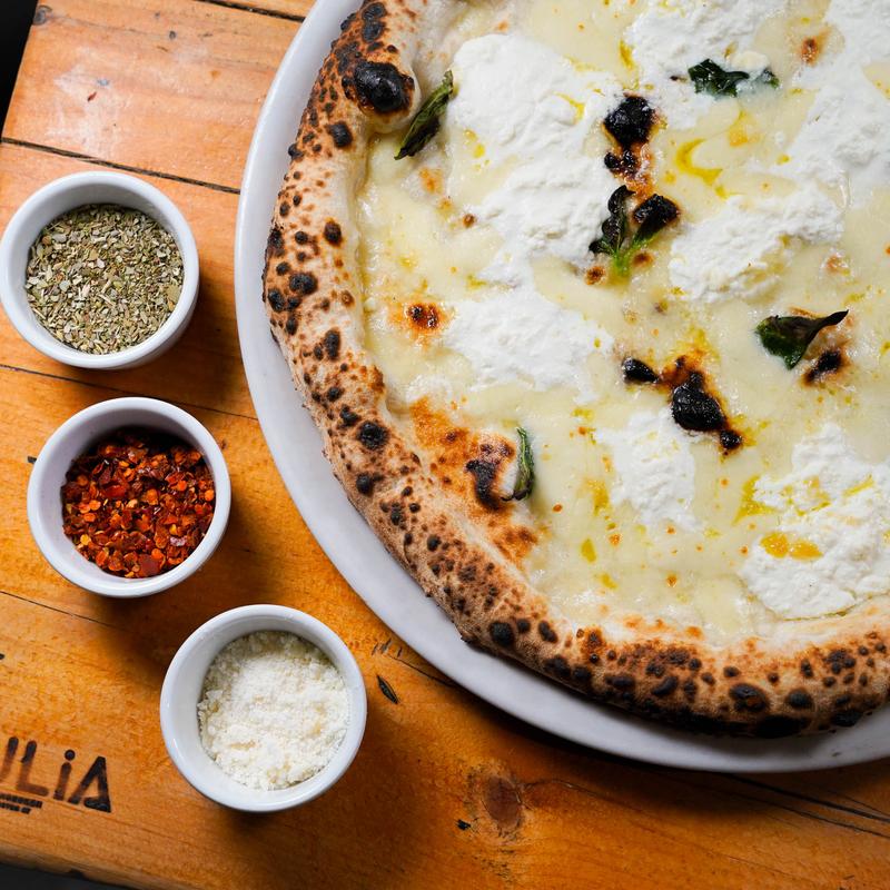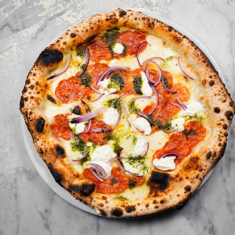 Mozzarella, ricotta, basil pesto, red onions & spicy soppressata. (Contains nuts)